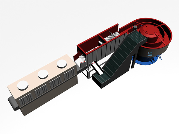 磨料回收循环机构由人字形橡胶传输带,将振动分料机分选出的研磨石输送到振动筛选机进行分选后,再流到隧道式振动研磨机内进行产品研磨,再循环使用(注:将研磨石输送到振动筛选机内,可将研磨石废料进行筛选分离,防止研磨石及产品研磨时产生批锋,夹塞到产品里面,可以将小的磨料进行分离处理。