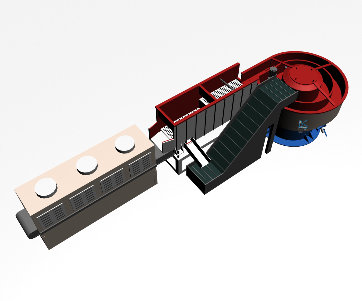磨料回收循环机构由人字形橡胶传输带,将振动分料机分选出的研磨石输送到振动筛选机进行分选后,再流到隧道式振动研磨机内进行产品研磨,再循环使用(注:将研磨石输送到振动筛选机内,可将研磨石废料进行筛选分离,防止研磨石及产品研磨时产生批锋,夹塞到产品里面,可以将小的磨料进行分离处理。