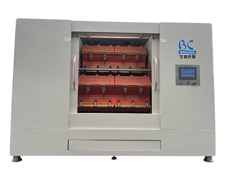 本机通过电机带动大转盘公转时,在同步轮的作用下,使用组研磨桶同时形成反向等速自转,使研磨桶内的工件与磨料在双重离心力的作用下产生强力磨擦,从而达到高效均匀地完成各种零件的抛光。